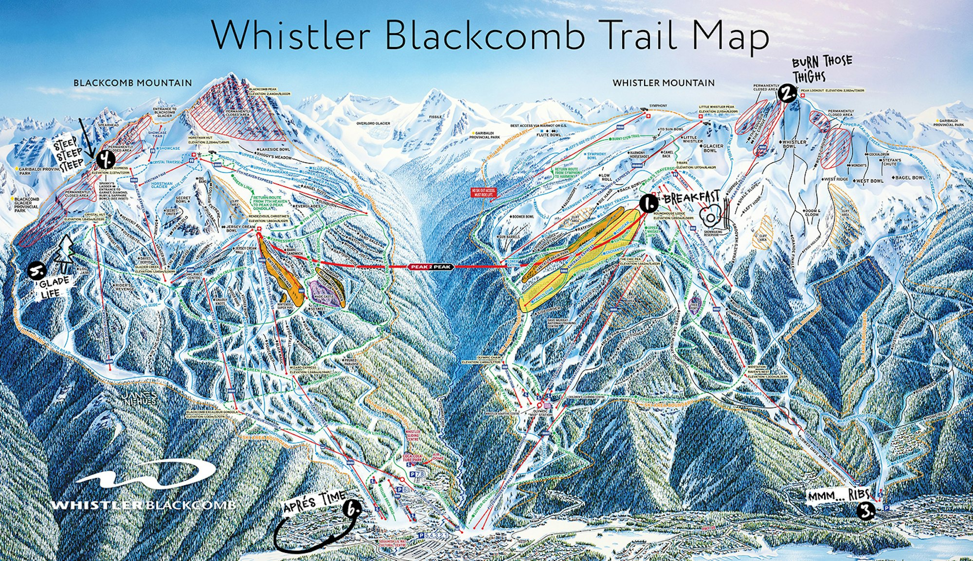 Finish your day in the sun on the south side of 7th Heaven. Upper Panorama features stunning views of Black Tusk as you make your way down Blackcomb to hit après at Merlin’s with a mountain of nachos and an ice-cold Kokannee.
